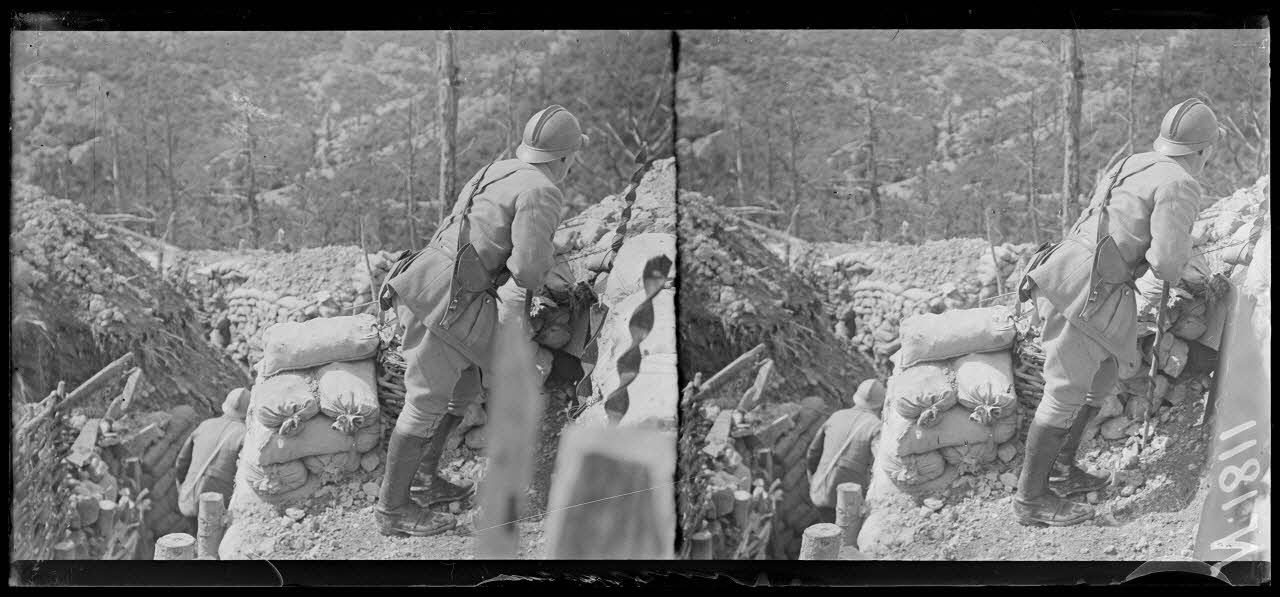 - Près de La Harazée, dans le sous secteur de Condé, (Marne, 17/08/1917), les lignes de tranchées sont occupées par les soldats français. Guetteurs et mitrailleurs sont postés dans leurs trous de combat.