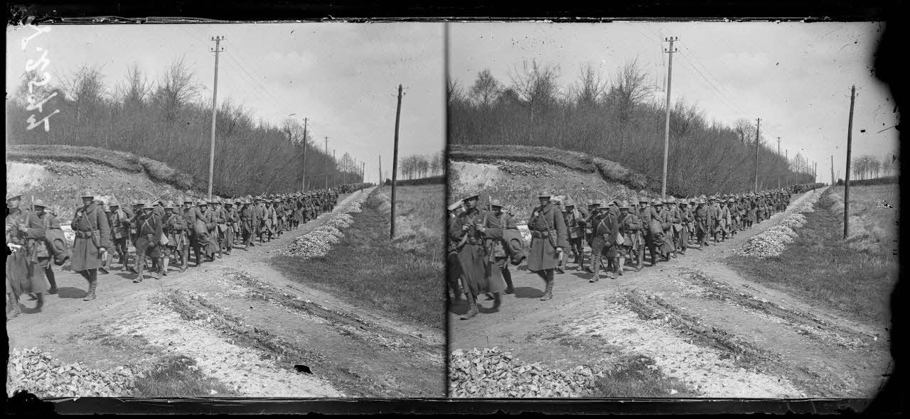 Troupes françaises et américaines se préparant à partir en zone de combat, Oise, avril 1918.