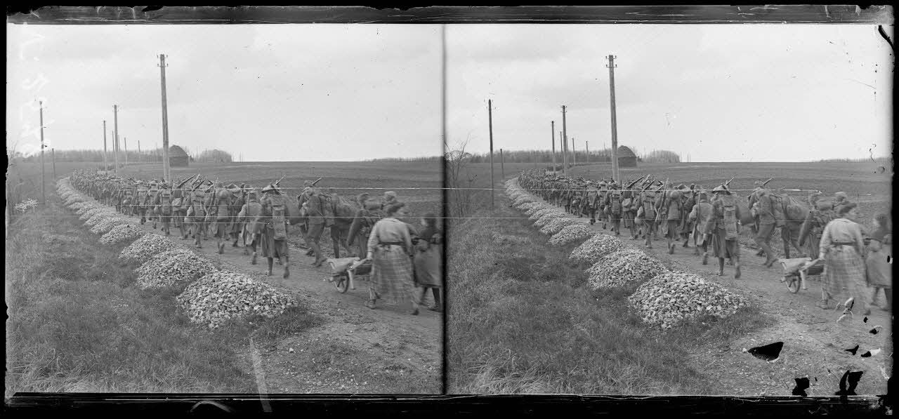 - Près de Méru (Oise, 01/04/1918, V 2555 à V 2566) du matériel agricole est évacué vers l'arrière du front pour être préserver de la destruction. Des troupes françaises arrivent par wagon pour renforcer le front.
