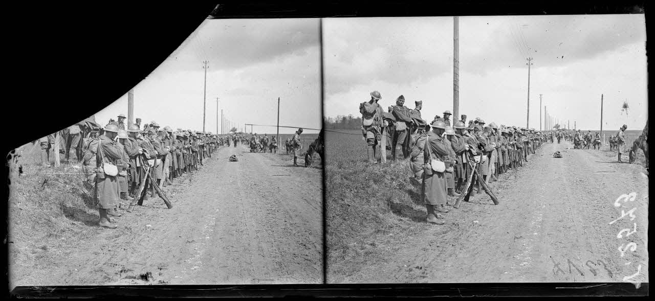 Troupes françaises et américaines se préparant à partir en zone de combat, Oise, avril 1918.