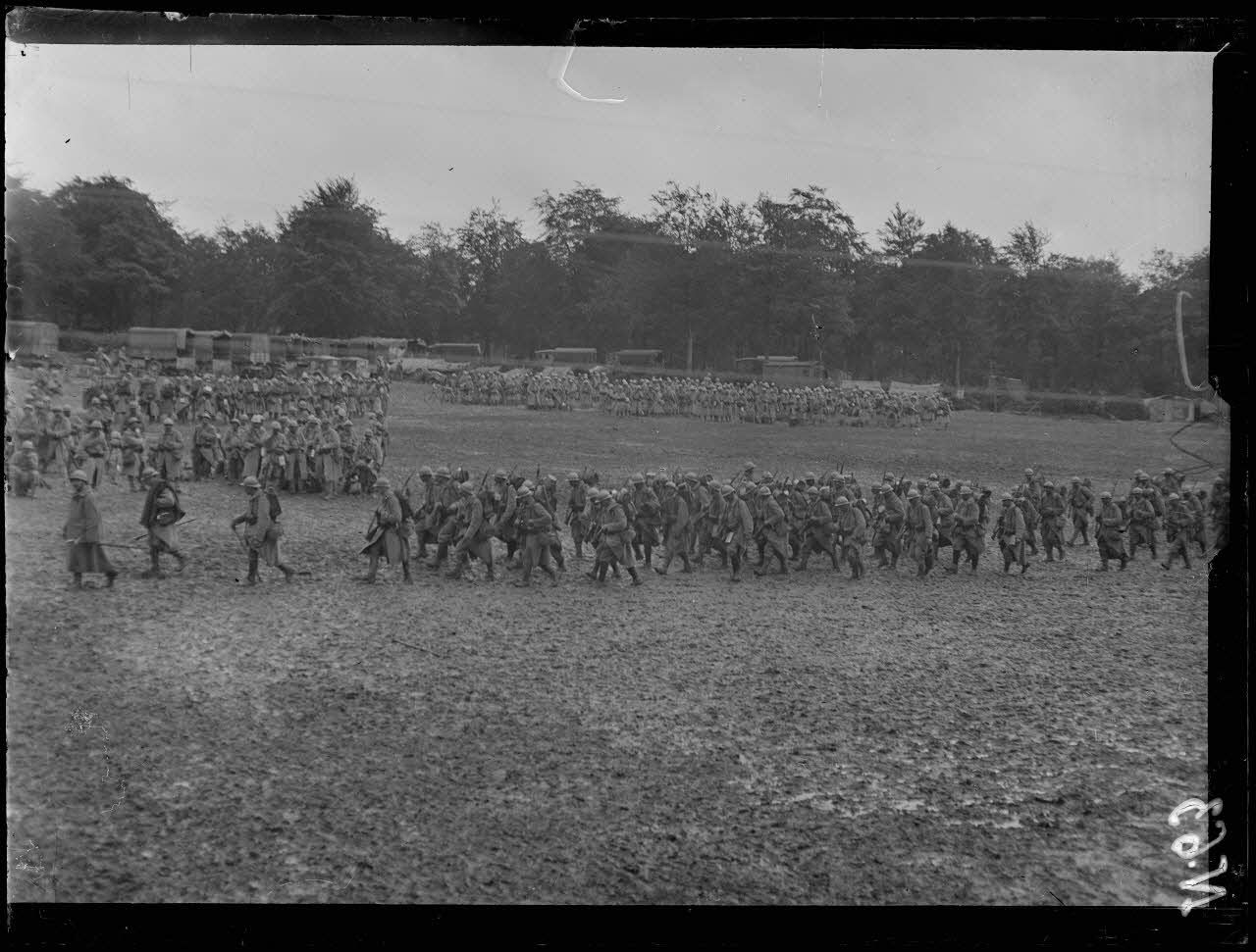 Près de Nixéville (Meuse), route de Verdun, troupes quittant le cantonnement pour se rendre aux tranchées. [légende d'origine]