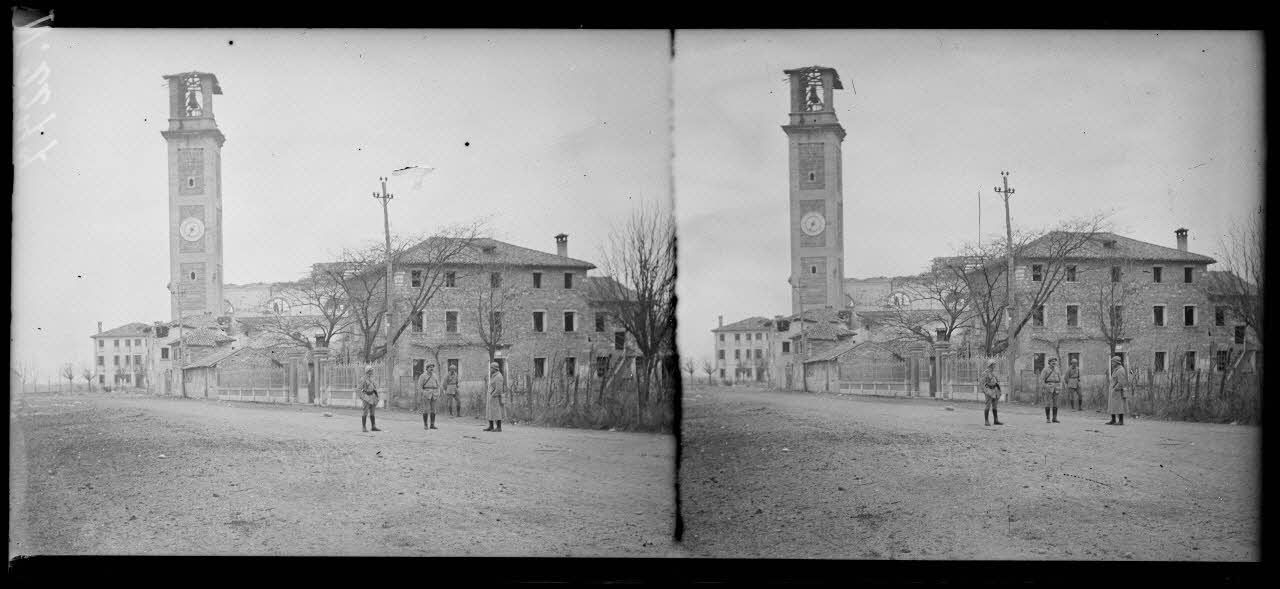 Près de Piève (localité d'Onigo), dont on voit l'église, une ligne d'abris a été installée, dont l'un se trouve dans la cour d'une ferme. Vue d'une tranchée à proximité du village et d'une tranchée creusée sous le talus de la voie ferrée. Des sentinelles sont visibles au bord de la Piave. Vue d'un pont sur l'embouchure de la Curogna, affluent de la Piave, et d'une passerelle sur le canal de la Brentella, point de liaison des brigades françaises et italiennes. Des clichés montrent l'intérieur du PC d'un bataillon installé dans une ancienne auberge, au moment du repos, et l'heure de la soupe devant un abri.