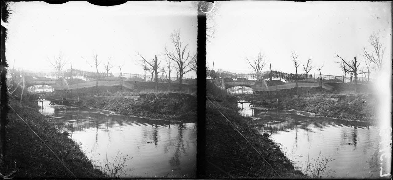 Près de Reims (Marne). Le canal de la Neuvillette. La passerelle et le camouflage. [légende d'origine]
