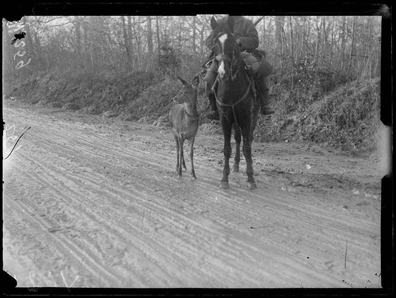 Sur la route de Reims à Epernay, les hommes d'un régiment de chasseurs d'Afrique vont mouvement vers de nouvelles positions. Un biche est devenue la mascotte du régiment.