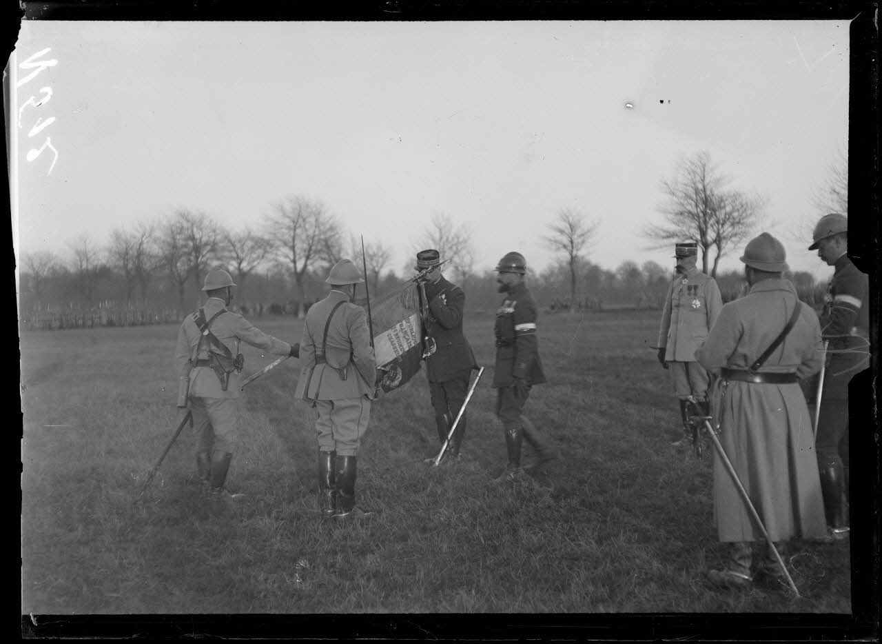 Près de Sainte-Ménehould (Marne), le général Gouraud décore le drapeau du 11e chasseur à cheval. [légende d'origine]