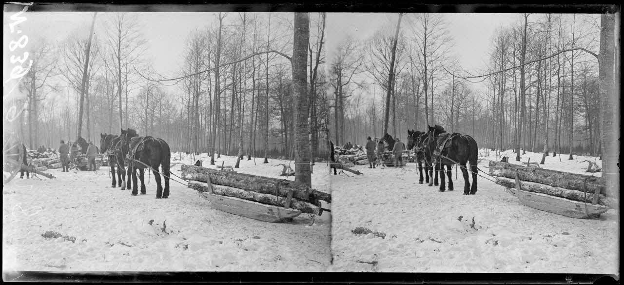 Près de Verrières (Marne). Exploitation forestière de la Haie Guérin. Transport d'arbres sur traîneaux. [légende d'origine]