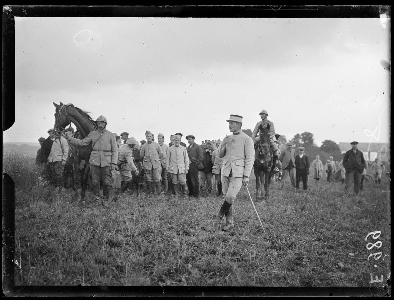 Près de Villers-Bretonneux (Somme). Revue passée par le général Joffre des troupes devant participer aux opérations (de la région de la Somme). Civils et militaires regardant la revue. [légende d'origine]