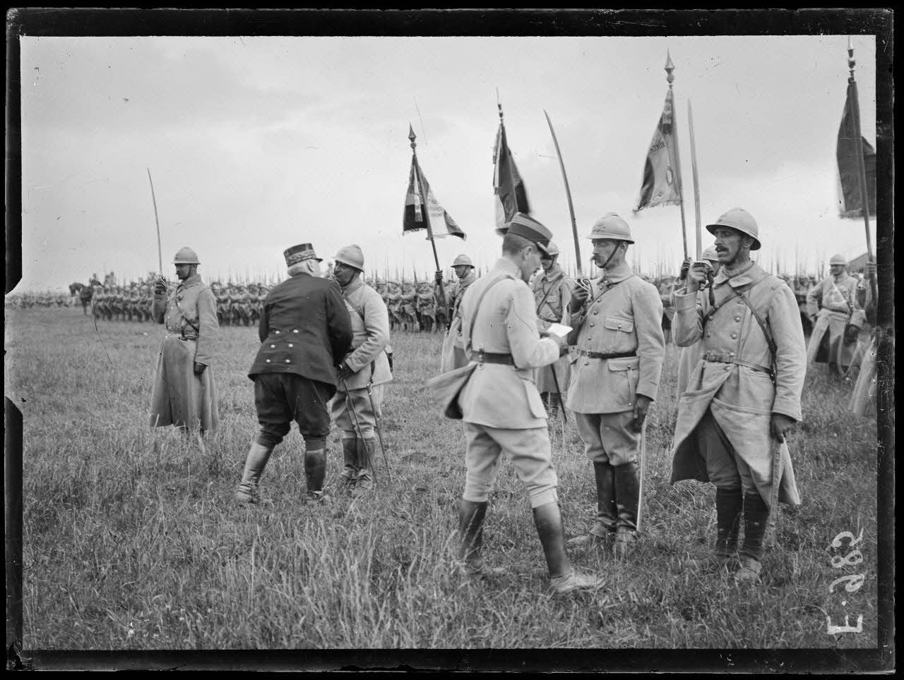 Près de Villers-Bretonneux (Somme). Revue passée par le général Joffre des troupes devant participer aux opérations (de la région de la Somme). Remise de décoration par le général Joffre.
