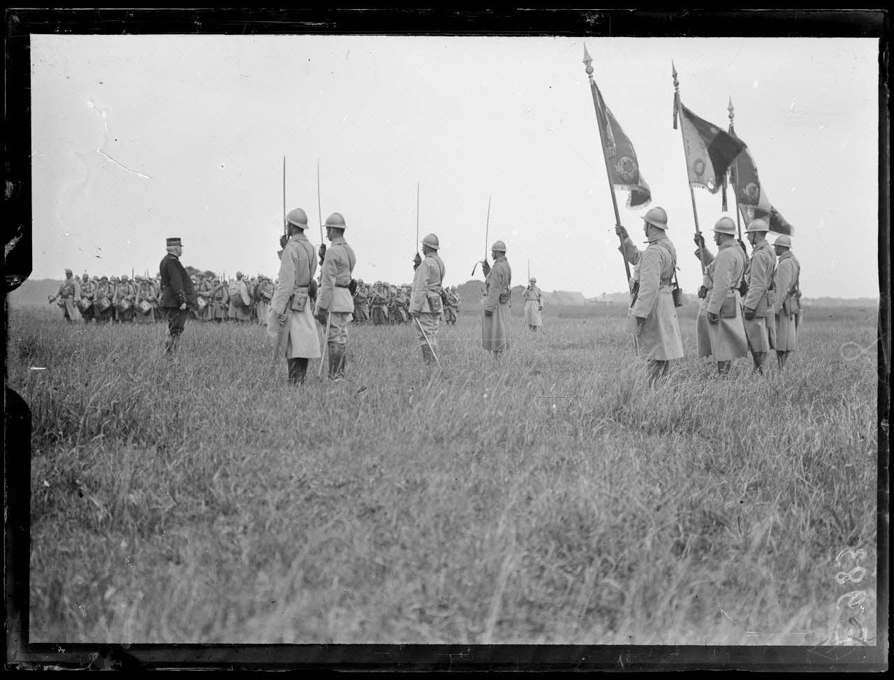 Près de Villers-Bretonneux (Somme). Revue passée par le général Joffre des troupes devant participer aux opérations (de la région de la Somme). Remise de décoration par le général Joffre.