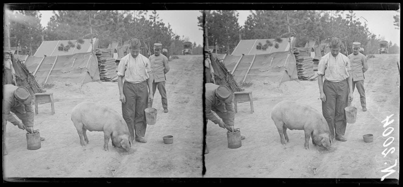 Près de Livry-sur-Vesle, des fantassins au cantonnement élèvent un porc. Non loin de là, un ballon d'observation français est parqué et camouflé. Dans un cantonnement d'artillerie, des chevaux sont alignés (N 2004 à N 2007).