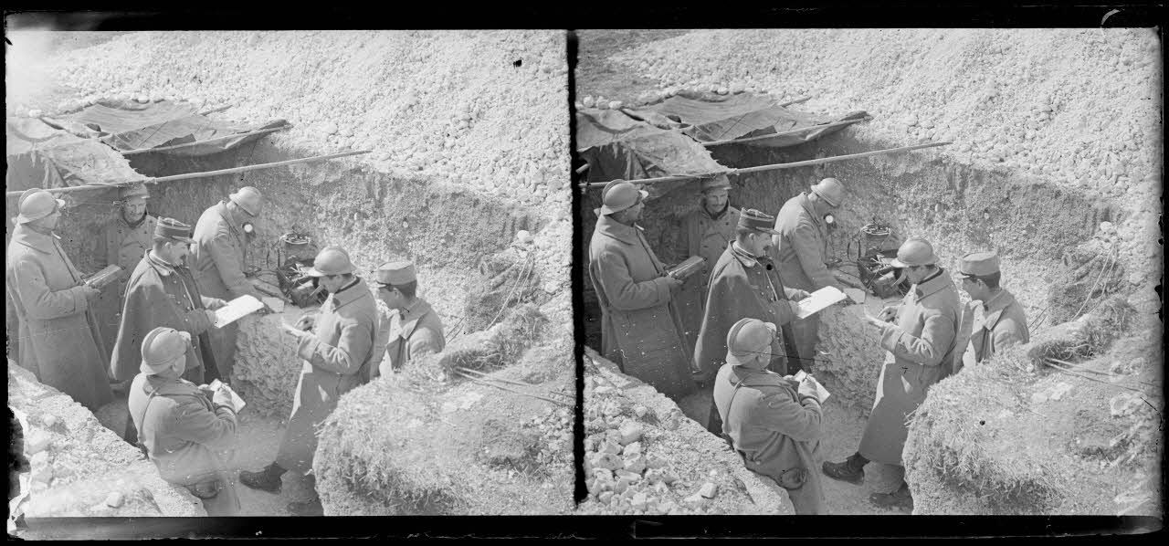 A Mourmelon-le-Petit, un canon de 400 mm est ravitaillé en obus. Une batterie de 32 cm modèle 1870-81 sur affût à glissement Schneider est en position sur un épi. Les artilleurs rectifient la position d’une pièce sur la voie ferrée avec des vérins et un treuil, puis chargent un obus. Le pointeur ajuste le tube et le tir est déclenché. Un poste téléphonique installé dans une tranchée communique avec les observateurs pour le réglage des tirs.