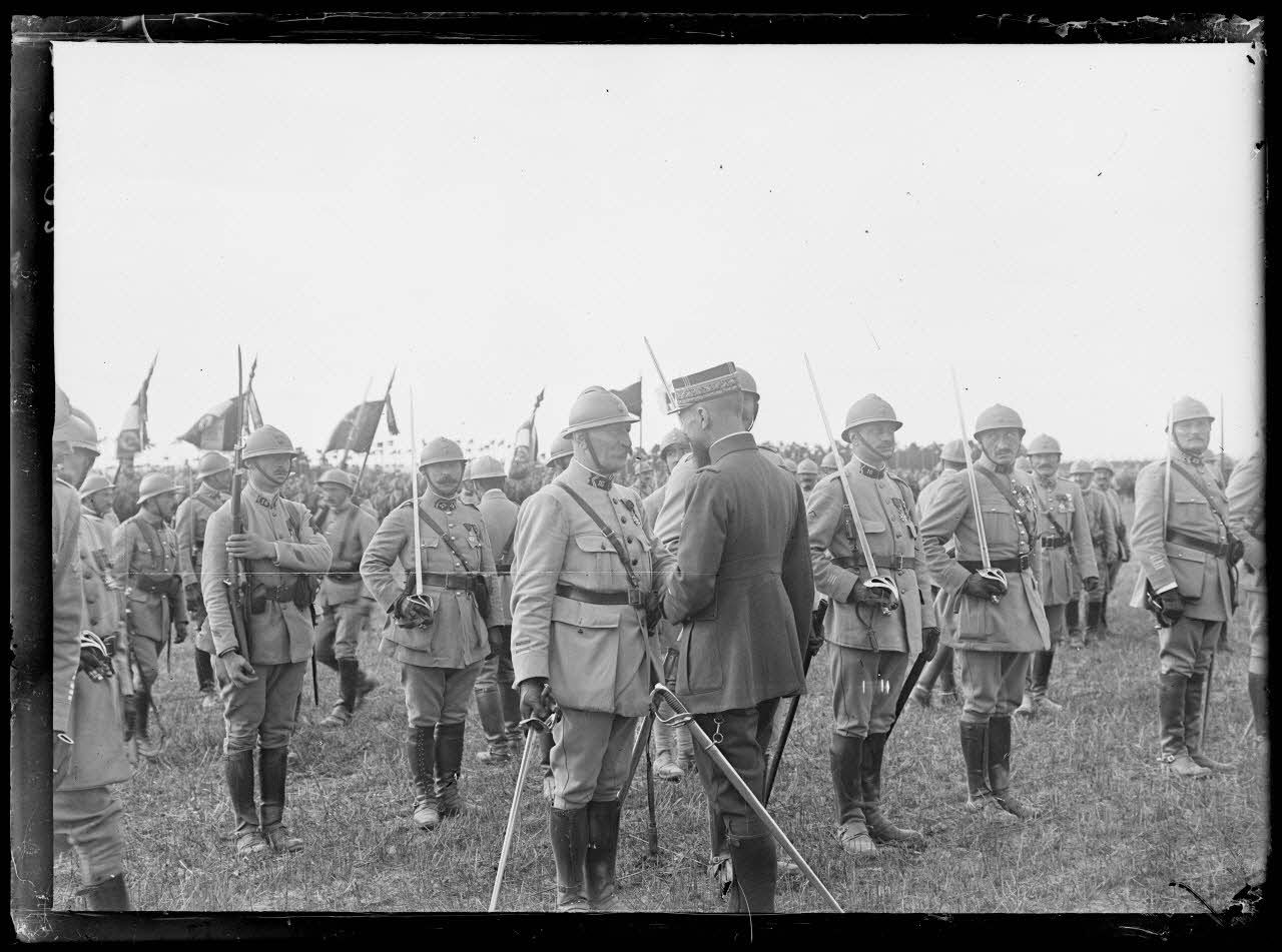 Près Mouy sur Seine. Seine et Marne. Ferme Saint Lucien. Le général Gouraud décore des étendards.