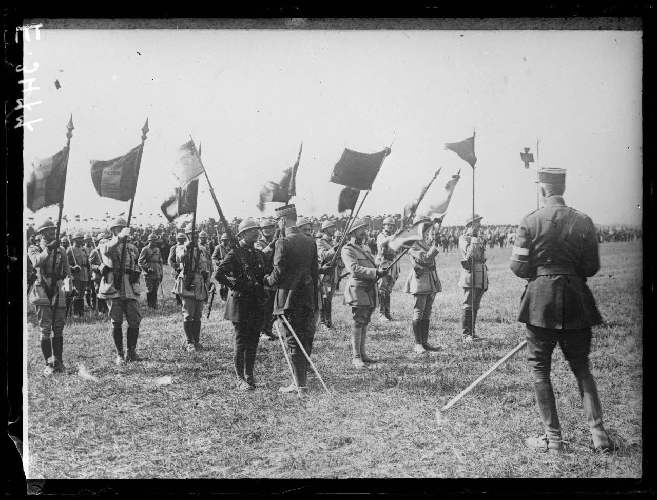 Près Mouy sur Seine. Seine et Marne. Ferme Saint Lucien. Le général Gouraud et les étendards pendant le défilé.