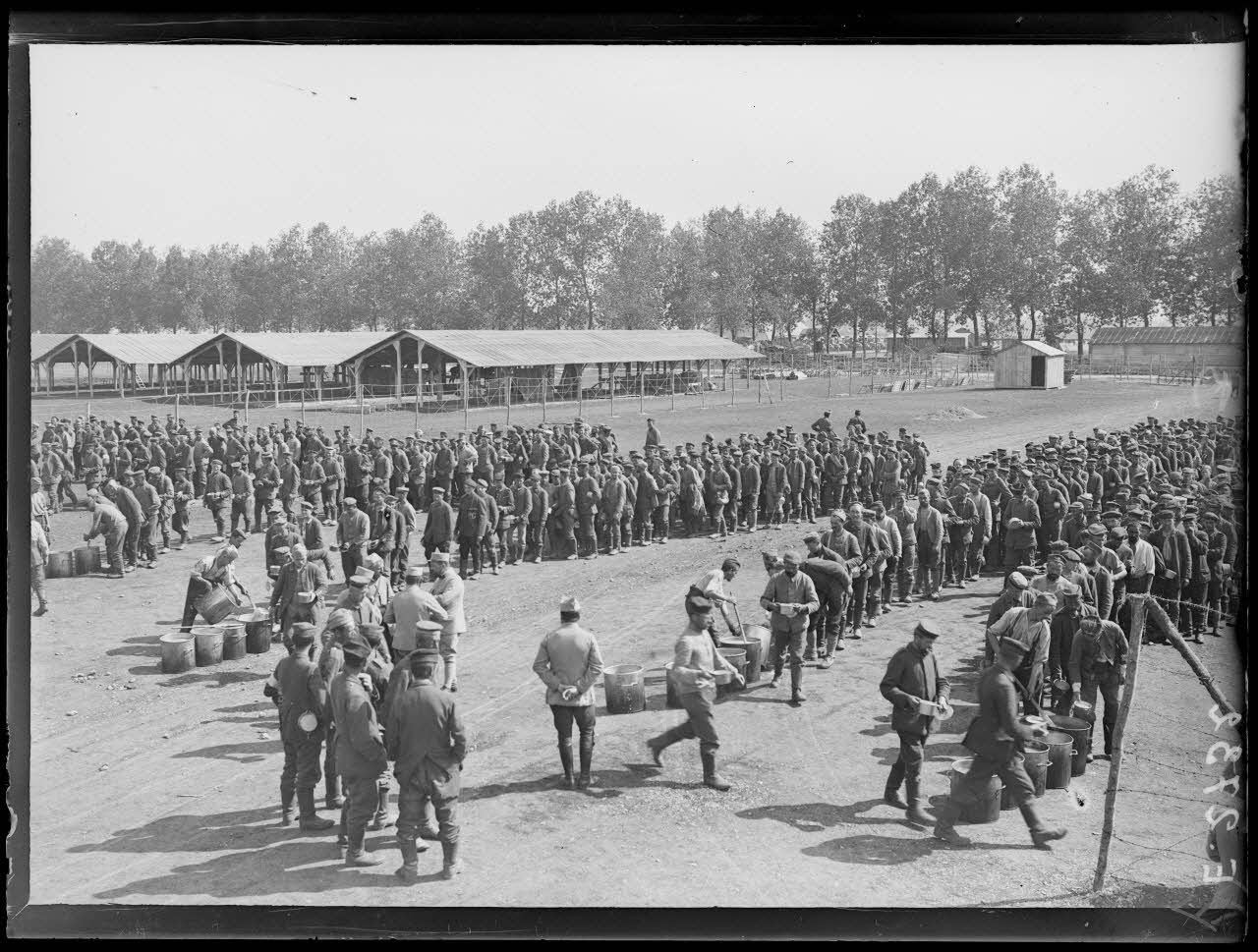 Près Saint Dizier. Haute Marne. Camp de prisonniers. Prisonniers attendant la soupe.
