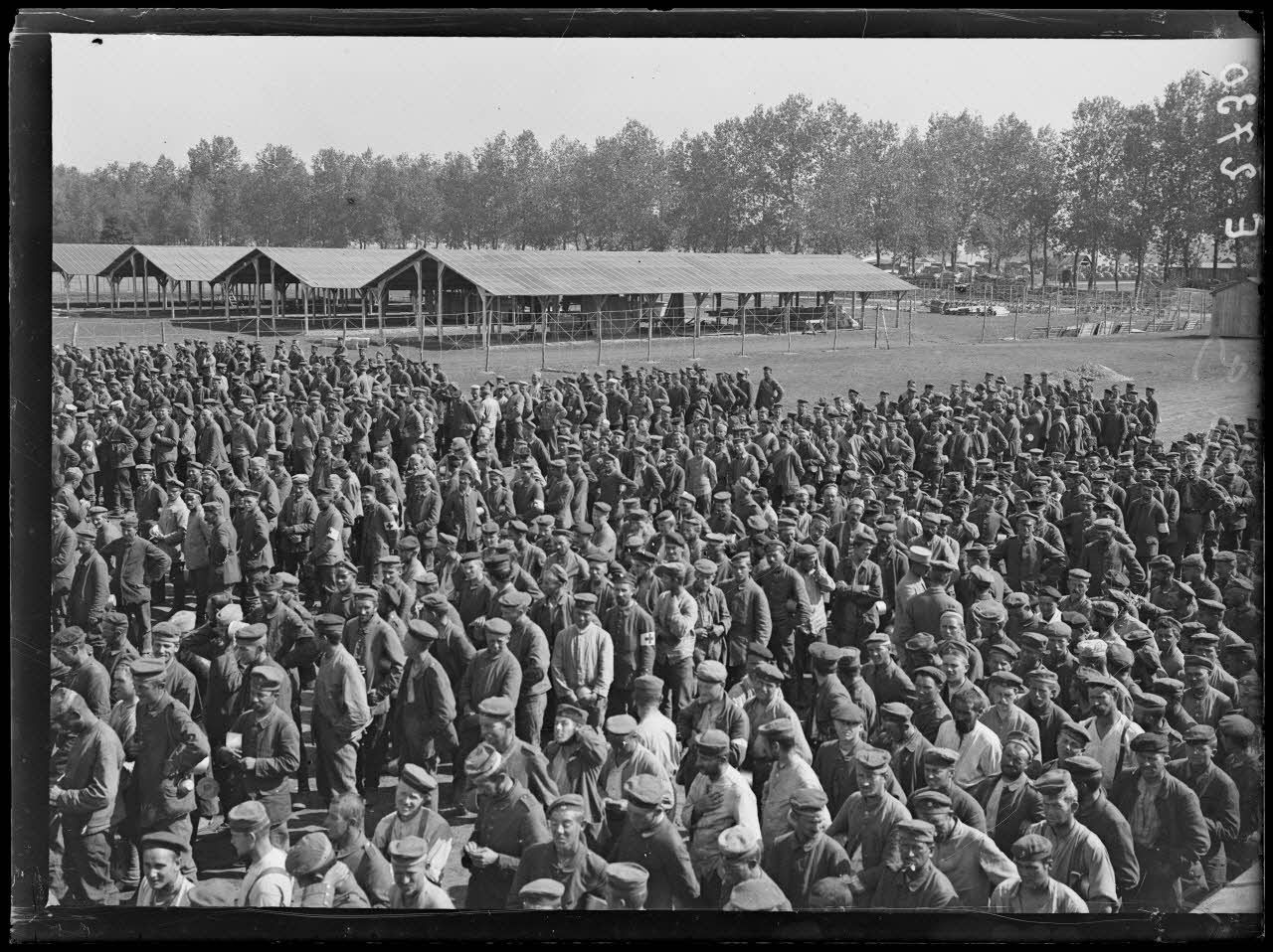 Près Saint Dizier. Haute Marne. Camp de prisonniers. Prisonniers attendant la soupe. [légende d'origine]