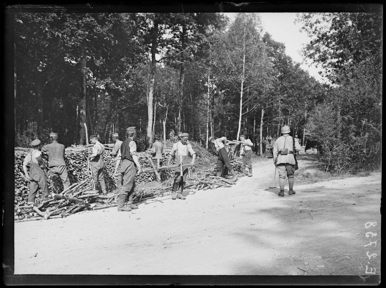 Près Saint Dizier. Haute Marne. Forêt du Val. Arrivage du bois coupé par les prisonniers. [légende d'origine]