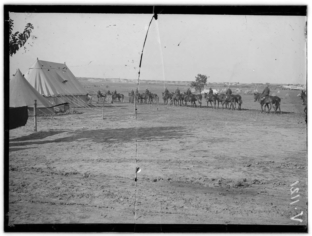 A quelques kilomètres du front balkanique, le camp de Salonique est occupé par la cavalerie anglaise et des pièces d'infanterie collective comme des mitrailleuses anglaises Vickers mises en batterie par des soldats australiens (V 1123).