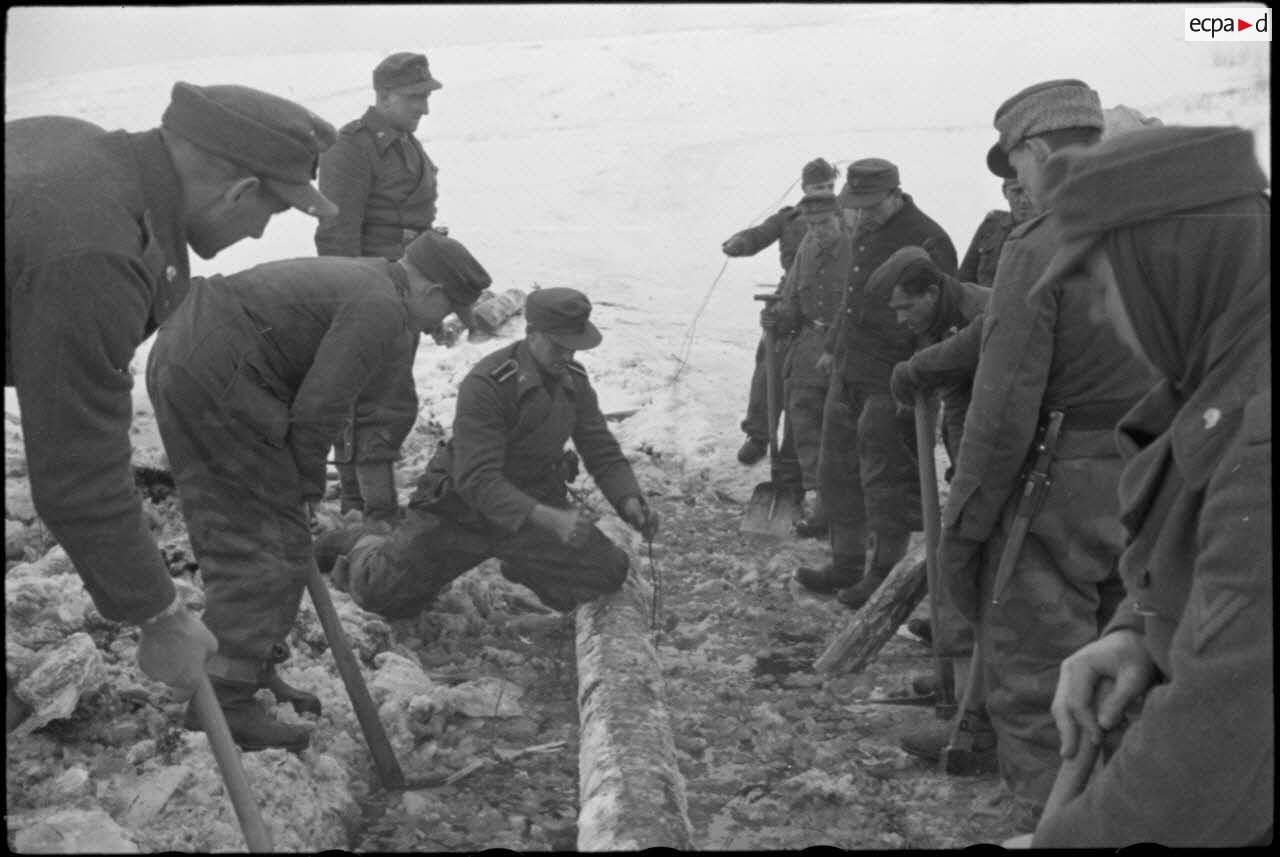 Un officier inspecte le front à bord d'une chenillette NSU "Kettenkrad" de l'armée de terre allemande. On note aux commandes de la moto-chenillée la présence de fantassins de la Luftwaffe, membre de la 4e division d'infanterie de l'armée de l'Air allemande (4. Luftwaffe Feld Division). Des fantassins de la même division partagent une bouteille. Un canon antichar de 7,5 cm Pak 40 tracté par un semi-chenillé RSO (Raupenschlepper Ost, voir le cliché Pk697 Film 970 L04). L'intérieur d'un semi-chenillé Sd.kfz.7, puis le même véhicule tractant un camion Opel-Blitz. Un obusier de 10,5 cm FH 18. Portraits d'un commandant (Major) Josef-Georg Mulzer, de la 95. Infanterie-Division, titulaire de la croix de chevalier de la croix de fer et des feuilles de chêne (obtenue le 10/01/1944). Portraits du Major Josef-Georg Mulzer (PK697 F969 L18 et L19), Deux commandants dont le Major Josef-Georg Mulzer discutent avec un officier, ce dernier est aux commandes d'un véhicule amphibie " Schwimmwagen " (PK697 F969 L20). Le même véhicule progresse, en arrière plan on reconnaît un blindé Panzer III (Ausführung N "Sturmpanzer") armée du canon de 7,5 cm. Une route défoncée nécessite l'intervention de fantassins et des artilleurs du 1er escadron du 519e (1./ Schwere Panzerjäger-Abteilung 519). Les rondins qui consolidaient la route sont détruits à l'aide d'explosifs. Le Nashorn baptisé "Büffel" commandé par le lieutenant (Leutnant) Albert Ernst du 1er escadron du 519e (1./s.Pz.Jäg.Abt-519). Le lieutenant commande le tir à bord du Nashorn " Büffel ". Albert Ernst posant devant le canon automoteur du Schwere Panzerjäger-Abteilung 519. Albert Ernst s'entretient avec des fantassins de l'armée de l'Air (PK697 F969 L37). Portraits d'un capitaine de réserve (Hauptmann der Reserve) Lothar Wehlitz décoré de la croix de chevalier de la croix de fer (Ritterkreuz obtenue le 06/02/1944). L'Hauptmann der Reserve Lothar Wehlitz est Chef du 1./schw.Art.Abt.845 (PK697 F969 L39 et L40).