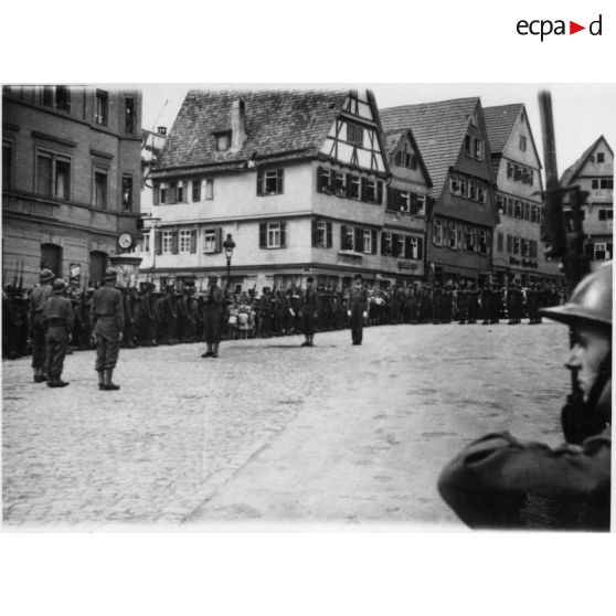 Archives photographiques du lieutenant François Paix de Boisset Glassac (1913-1992). Photographies de l'album légendées "Prise d'armes et défilé à Leonberg le 9 mai 1945".