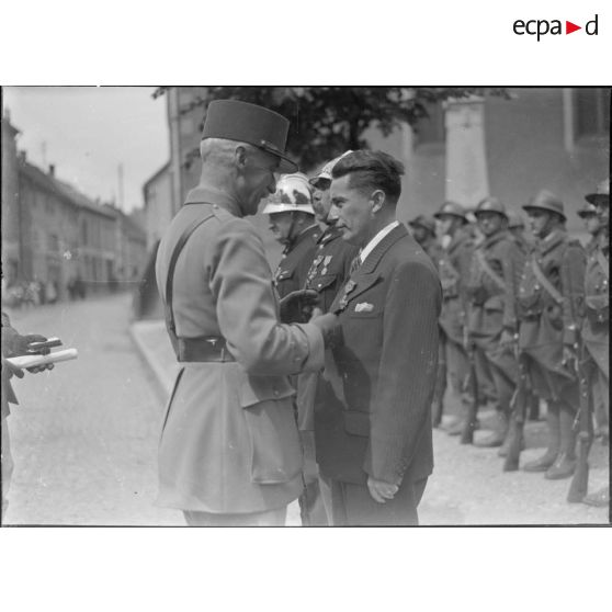 Le général décore deux pompiers (photos G40, G41) et un civil de la croix de guerre (photo G39). Un caméraman filme la remise de décorations avec sa caméra Lebay modèle 1930.