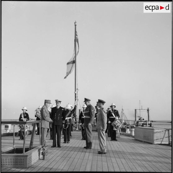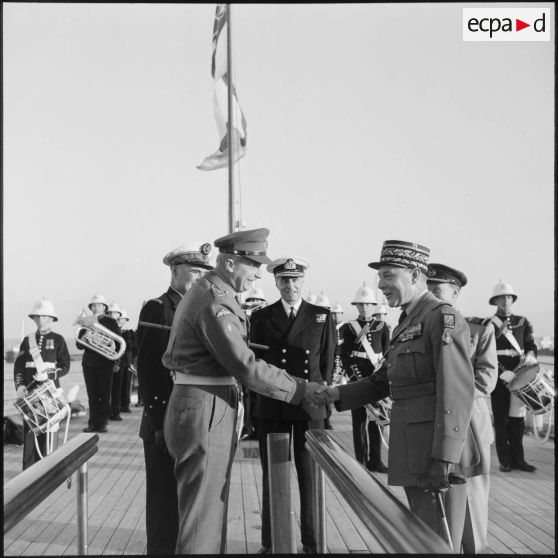 Cérémonie sur le quai d'embarquement de Port-Fouad, embarquement des dernières troupes françaises et dernière visite du général Beaufre au général Stockwell sur le HMS Tyne.