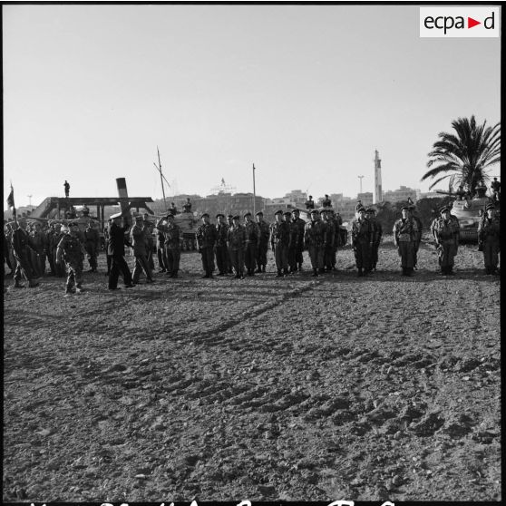 - sur le quai d'embarquement de Port-Fouad, une prise d'armes réunit les quelques combattants restant à embarquer au terme de l'expédition de Suez. Le général de division Beaufre, commandant la Force A (Forces terrestres françaises engagées dans l'expédition de Suez), le vice-amiral Lancelot, commandant la FNI (Force navale d'intervention), et le colonel Château-Jobert, commandant le 2e RPC (régiment de parachutistes coloniaux), assistent à la cérémonie (salut au drapeau du 2e RPC, revue des troupes),