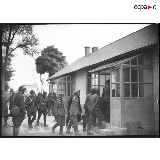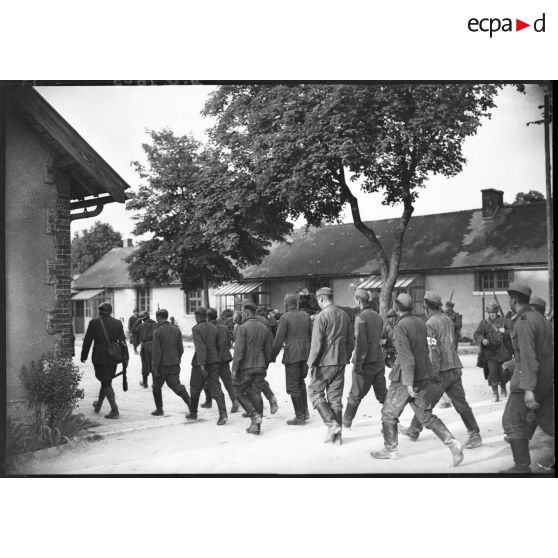 Un groupe de prisonniers allemands rentre dans une maison sous la surveillance de gardes républicains mobiles (GRM) et de soldats français.