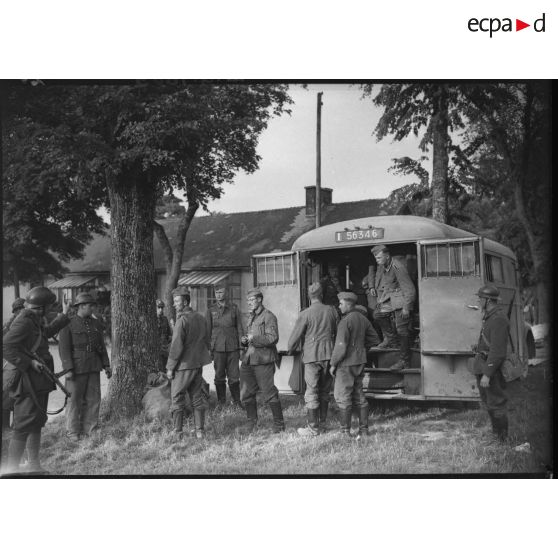Des prisonniers allemands montent dans un fourgon sous la surveillance de gardes républicains mobiles.
