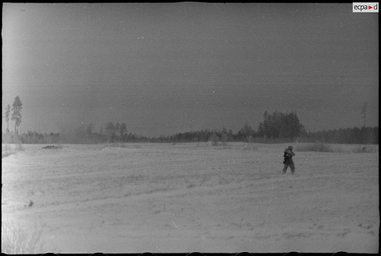 Progression dans la steppe russe de fantassins allemandes (Panzergrenadier) en soutien de Nashorn du schwere Panzerjäger-Abteilung 519.