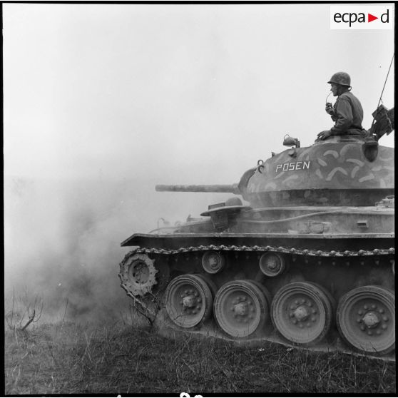 Progression du char de commandement du 3e escadron de marche du 1er régiment de chasseurs à cheval (RCC) au cours d'une offensive contre des positions de l'Armée populaire vietnamienne à Diên Biên Phu.