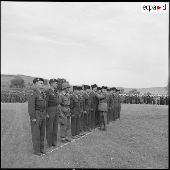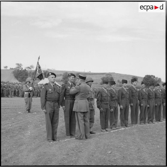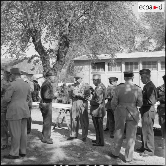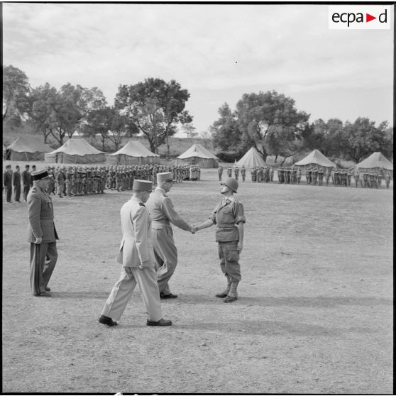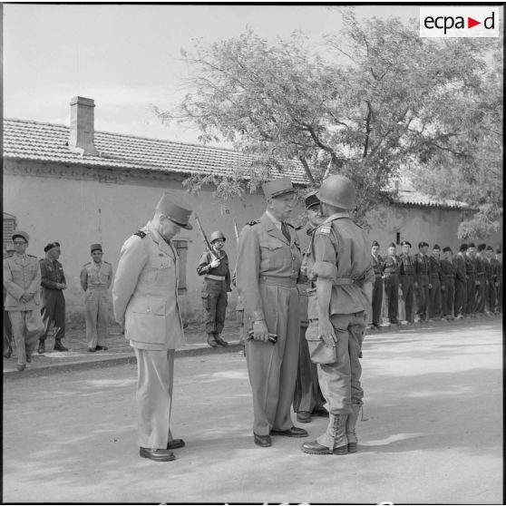 Le général Malagutti félicite un soldat qui vient d'être décoré.