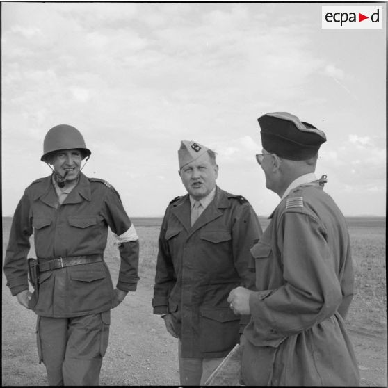 Le colonel Mollat du Jourdain s'entretient avec un général de brigade aérienne.<br>