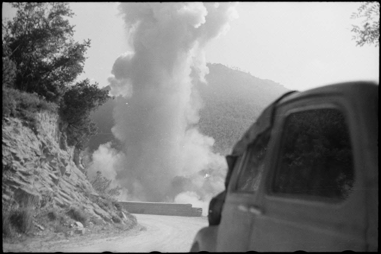 Protégé derrière une voiture, le reporter immortalise la destruction d'un pont dans le secteur de Montefalcone Nel Sannio.