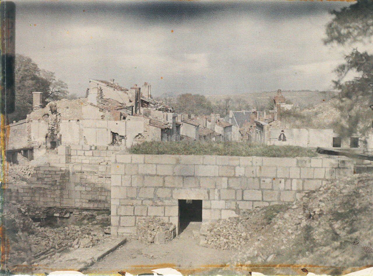 Note : cette autochrome ne correspond à aucune vue connue dans la collection Albert-Kahn, ou à la médiathèque de l'architecture et du patrimoine (MAP), ou décrite dans les archives de la SPCA. L'auteur et la date sont actuellement inconnus. Toutefois,il existe sur la plaque un numéro 767 (expertise de Ronan Guinée, du musée Albert-Kahn, le 13/11/2015) laissant à penser qu'il pourrait s'agir d'une vue de Verdun prise par Paul Castelnau. Dans le registre d'inventaire du MAK, il n'y a pas de n° 767 dans la liste des clichés pris à Verdun.