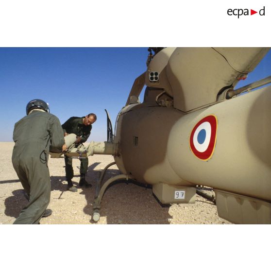 Deux mécaniciens du 5e RHC approvisionnent un hélicoptère de combat Gazelle SA-342 en missiles antichar hot.