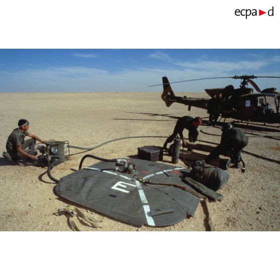 Ravitaillement d'un hélicoptère de combat Gazelle HOT en kérosène à partir d'un bac souple. Deux mécaniciens du 5e RHC arment un hélicoptère de combat Gazelle SA-342 en missiles antichar HOT.