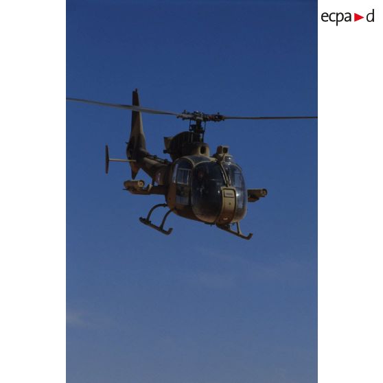 Un hélicoptère de combat Gazelle Canon du 5e RHC, équipée de son canon de 20 mm, effectue un vol de reconnaissance dans le désert.