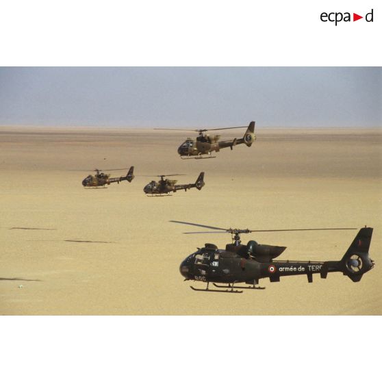 Quatre hélicoptères Gazelle HOT non approvisionnés en patrouille dans le désert.