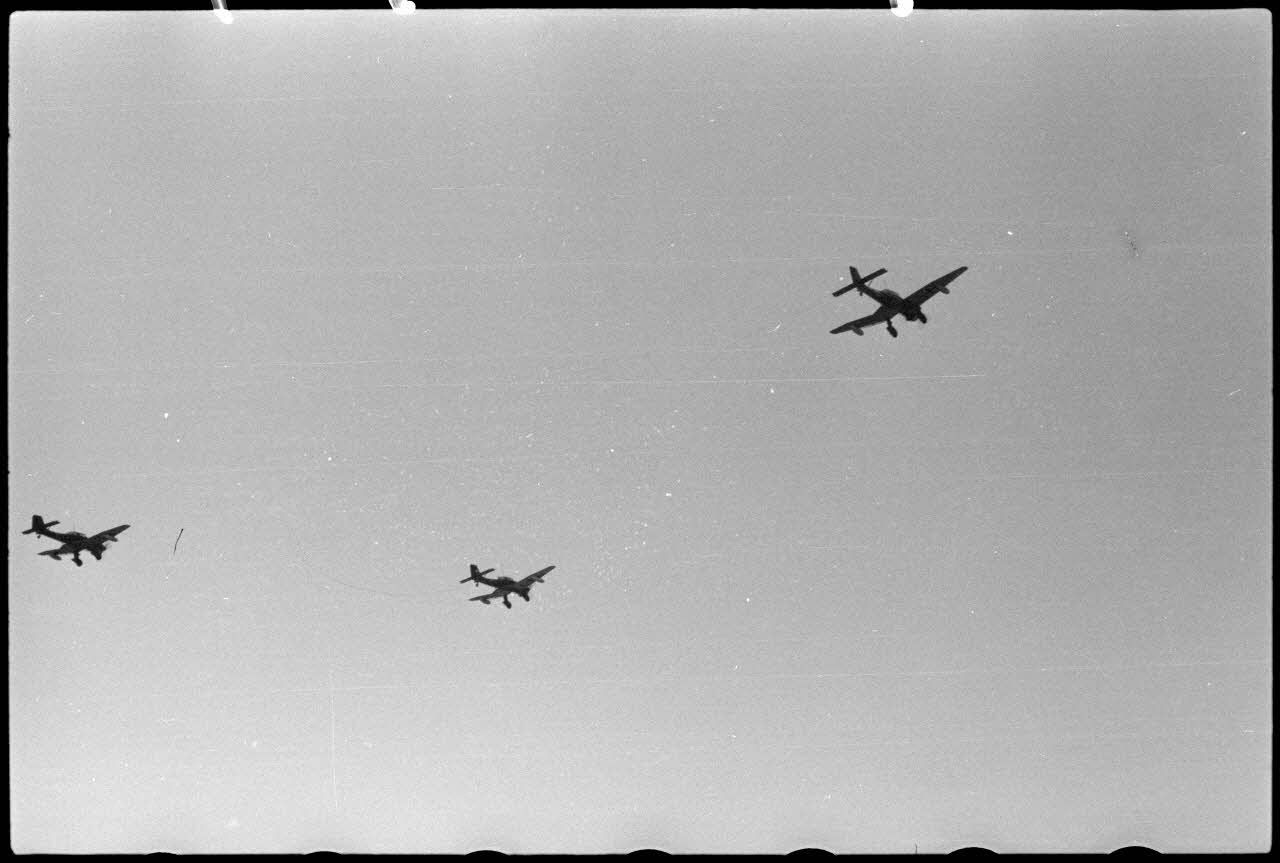 Enfin, deux chasseurs Messerschmitt Me-109 touchent le sol du terrain d'aviation. Ces avions constituaient peut-être l'escorte des remorqueurs durant l'exercice.