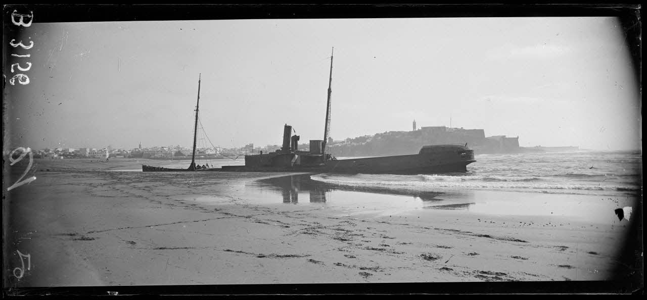 Rabat, à l’entrée du port, navire ensablé sur la plage de Salé. [légende d’origine]