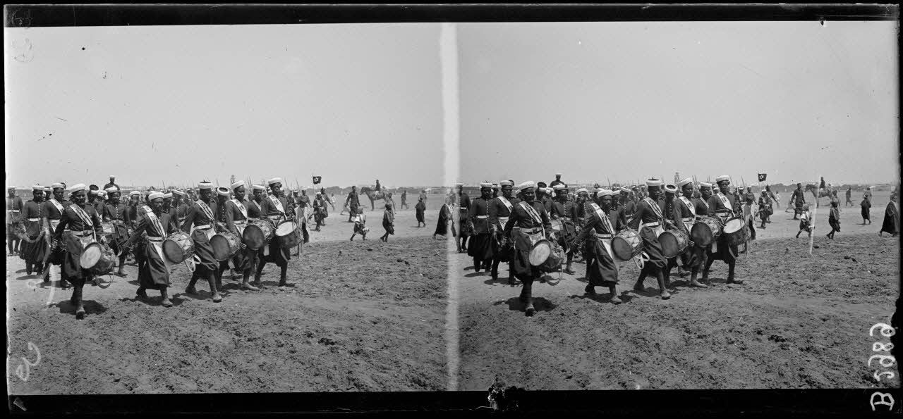 Rabat, la musique de la garde d’honneur du sultan arrivant au palais pour la cérémonie du vendredi. [légende d’origine]