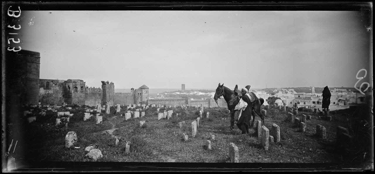 Rabat, vue prise du cimetière arabe sur la ville à droite, la tour Hassan (au centre) et les remparts de la kasbah des Oudaya. [légende d’origine]