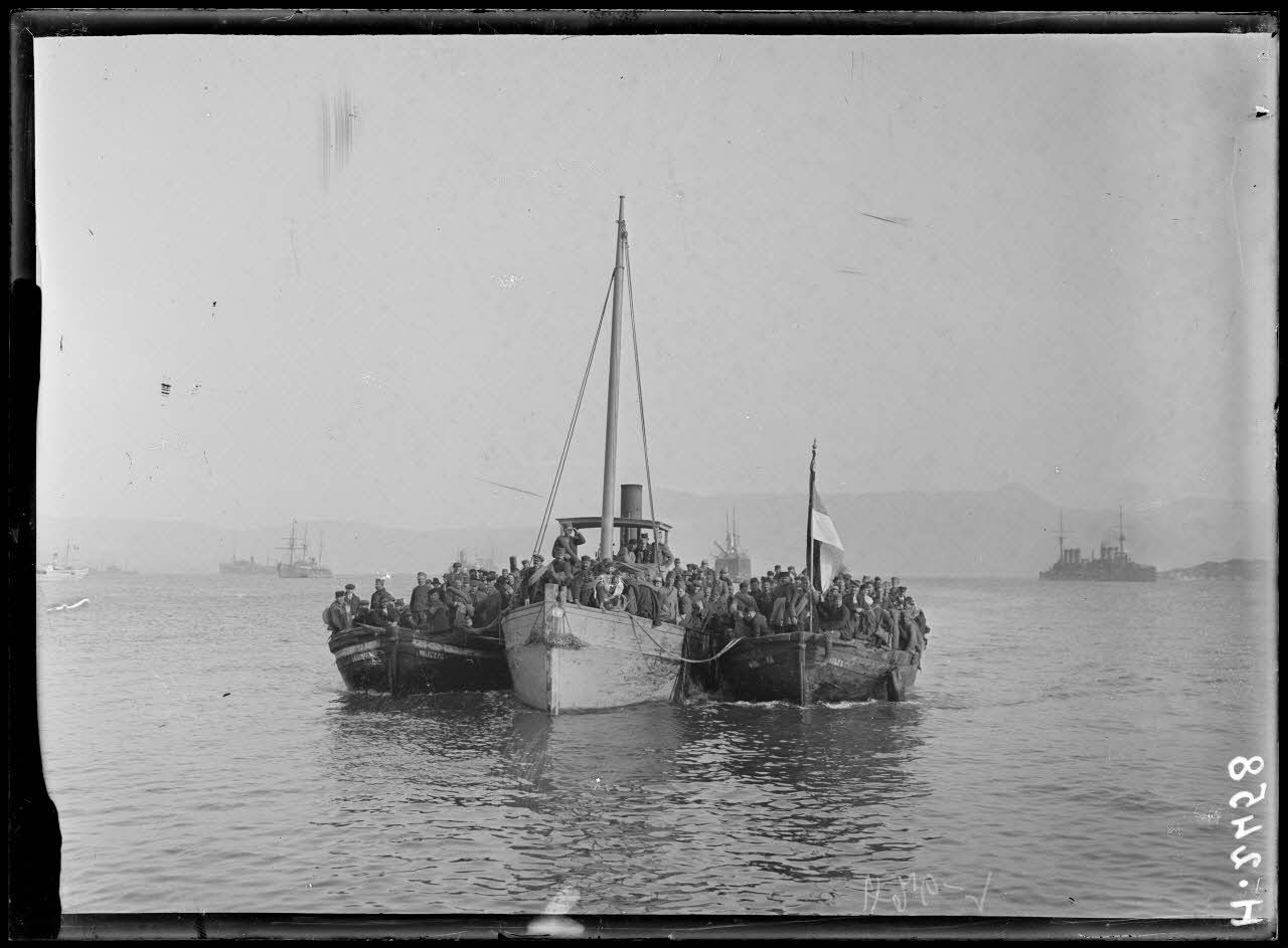Rade de Corfou. Transbordement sur un transport. Des troupes de différentes unités amenées sur un transport.