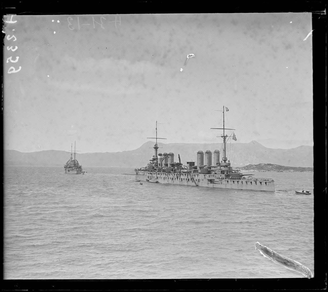 En rade de Moraitika. L'arrière du Miquelon et le croiseur cuirassé Victor Hugo.