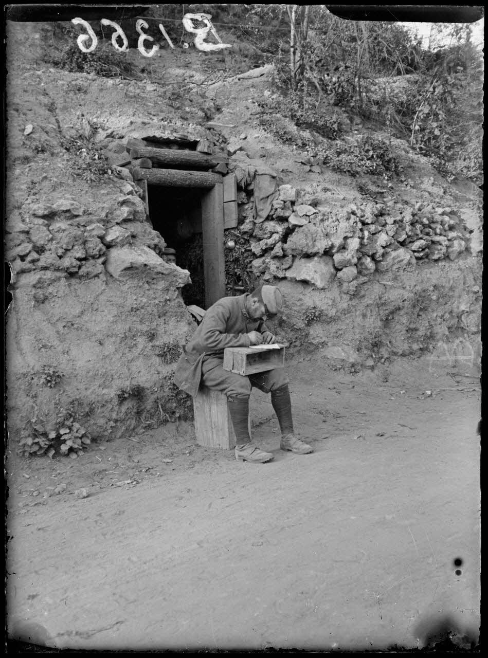 Ravin de Brimont (Oise). Devant une cagna, un soldat fait son courrier. [légende d'origine]