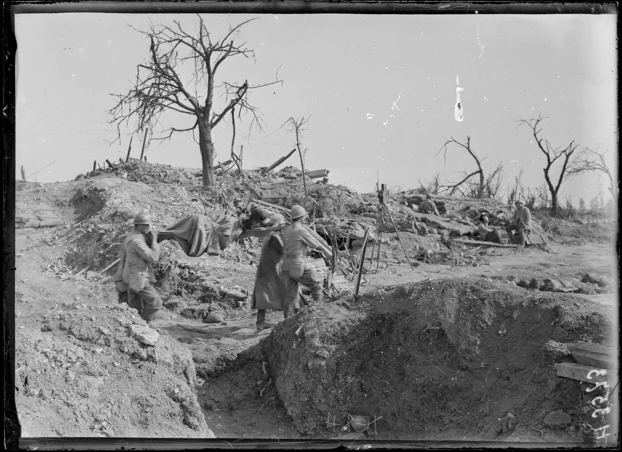 Ravin de la Saucisse, sud ouest de Cléry. Boches venant d'être faits prisonniers transportant blessés français [légende d'origine]