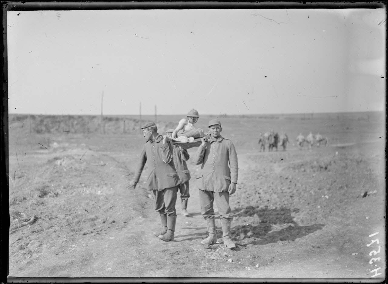 Ravin de la Saucisse, sud ouest de Cléry. Boches venant d'être faits prisonniers transportant blessés français