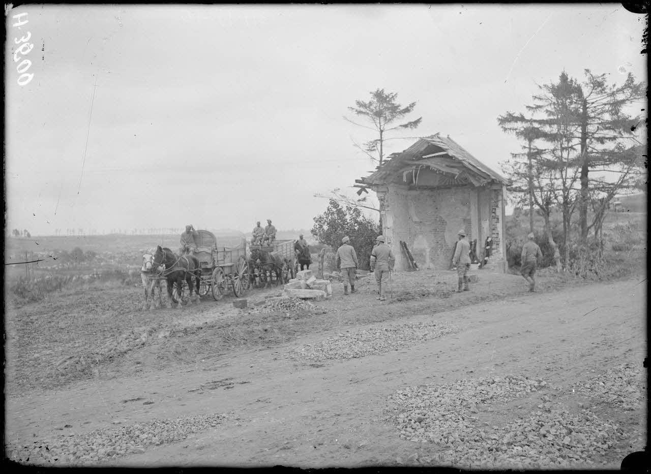 A Eclusier, des chalands transportant des pierres sont déchargés dans des camions pour la réfection des routes. Plus loin, un caveau funéraire de cimetière a été transformé en abri contre les bombardements.