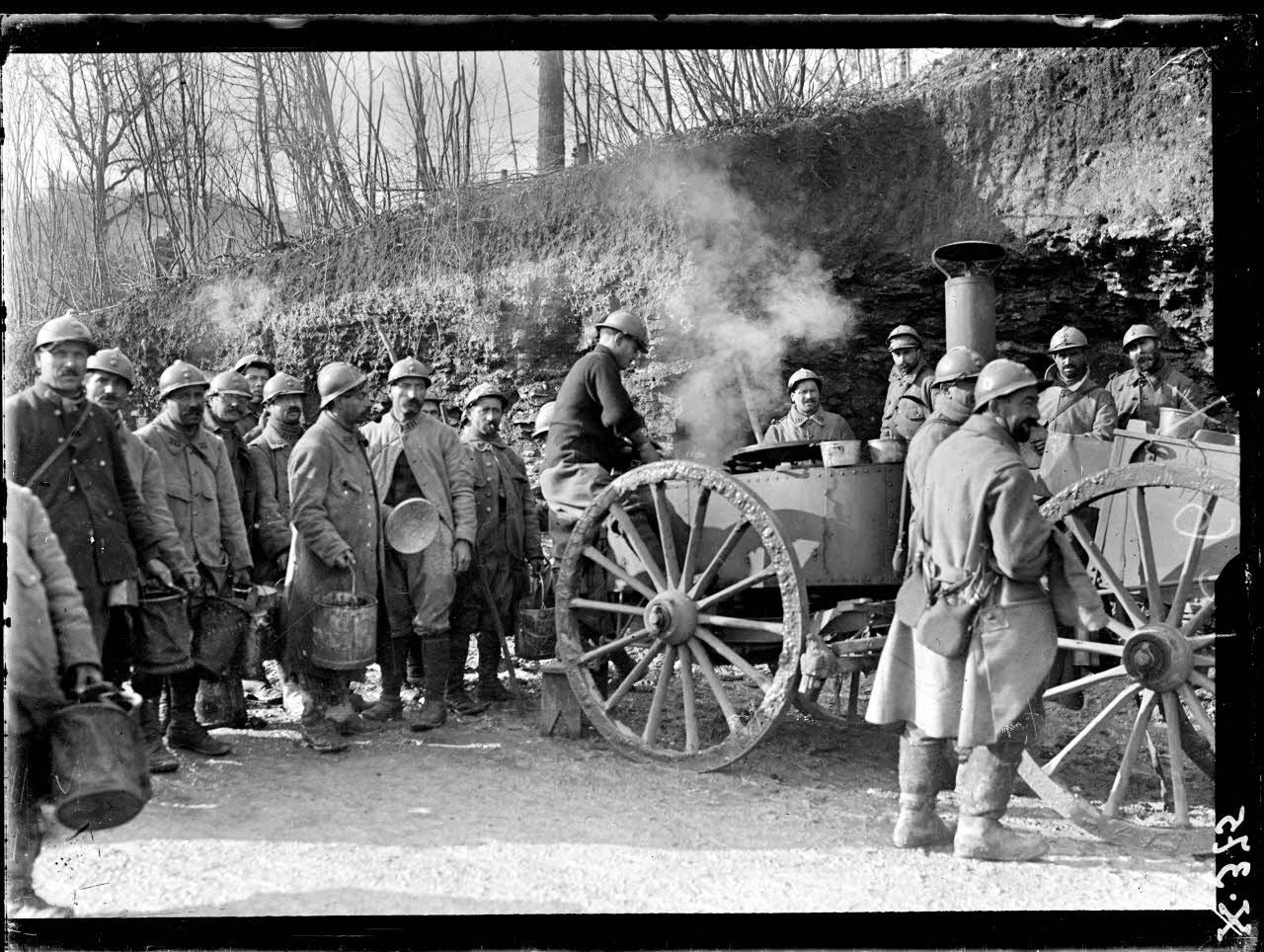 - des soldats du 124e RIT (régiment d'infanterie territoriale) mangeant près d'une cuisine roulante dans le ravin Saint-Jacques ;