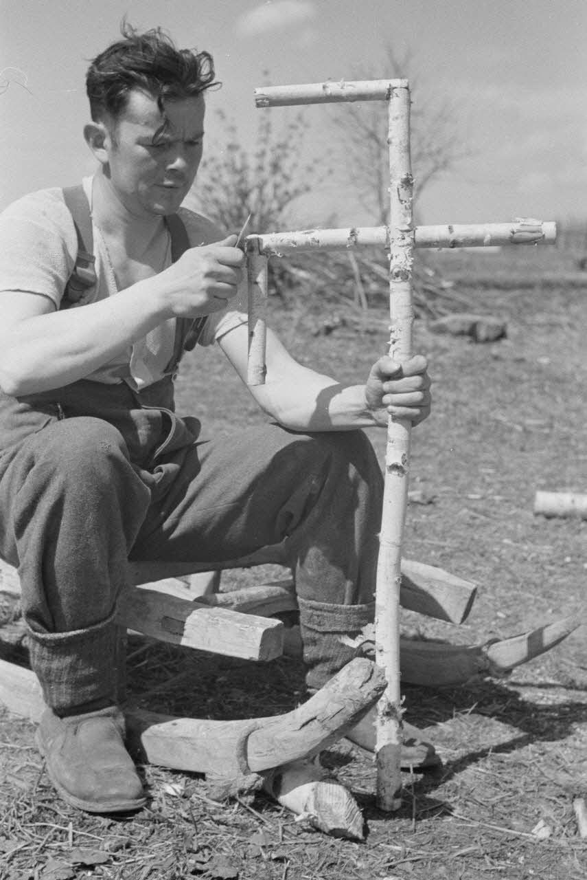 Réalisation d'une swastika dans du bois de bouleau pour la décoration d'une isba réquisitionnée par la Luftwaffe.